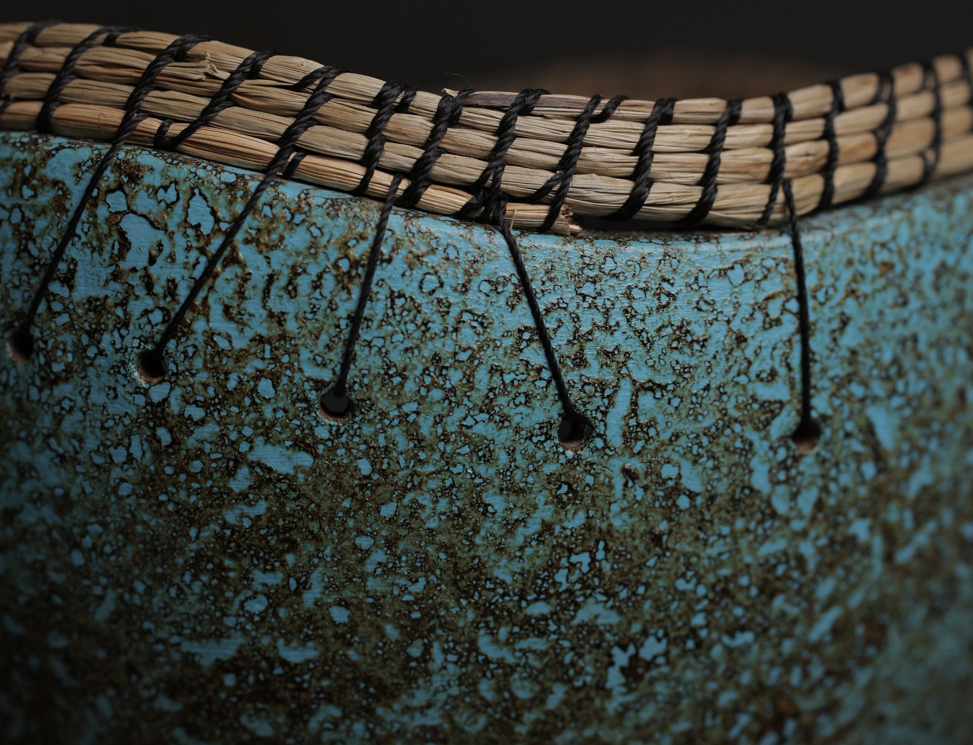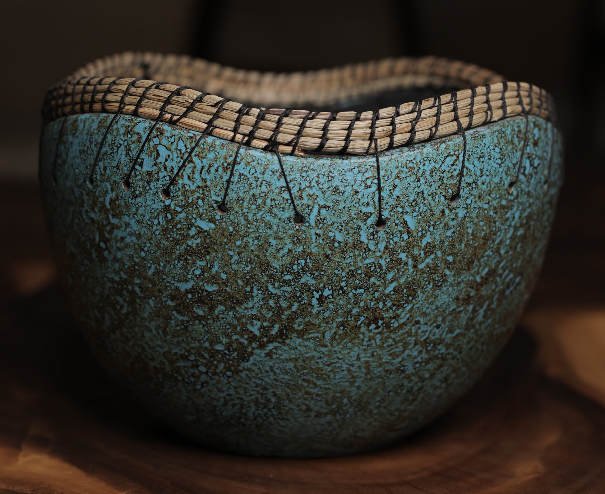 A stunning, handcrafted terracotta bowl featuring a rustic turquoise glaze and a unique, hand-woven fiber rim. A perfect decorative accent with an earthy, artisanal touch.