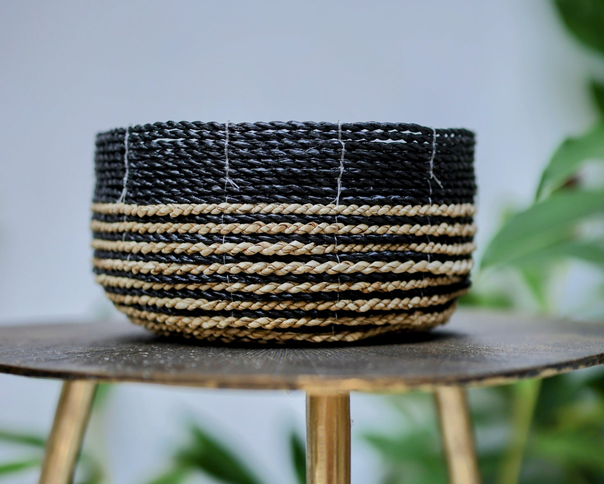 Add a touch of modern, bohemian style to your home with this set of three woven seagrass baskets. Featuring a striking striped design in black and natural tones, these versatile bowls are perfect for organizing essentials, serving as decorative catch-alls, or housing small plants