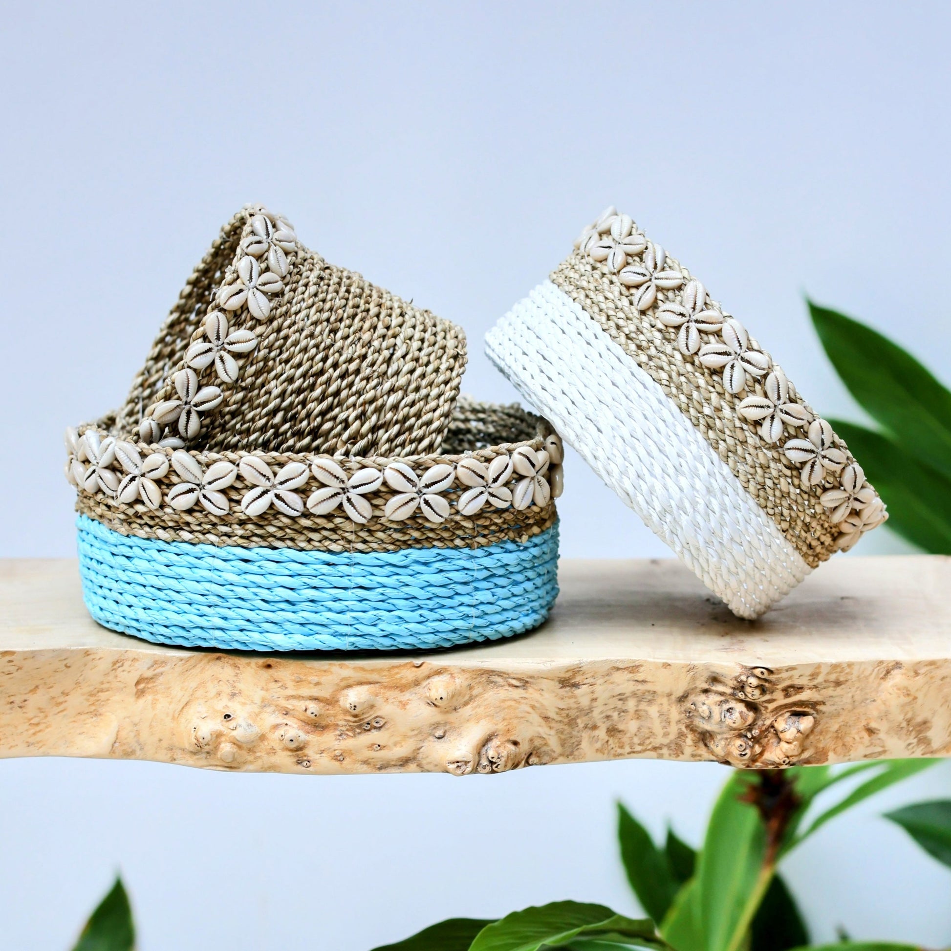 Maren Coastal Blue Seagrass Baskets with Cowrie Shells (Set of 3)