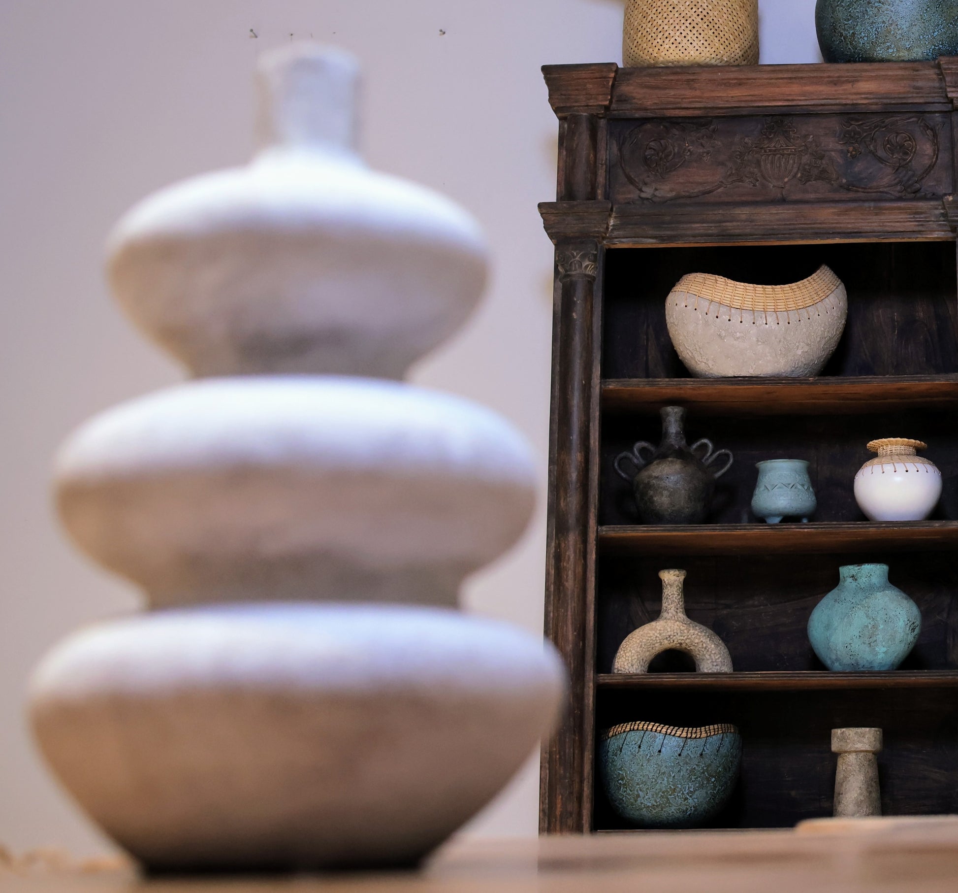 A celebration of pure, organic form. This sculptural vase is hand-formed from terracotta, showcasing a balanced, triple-gourd silhouette. Its surface is finished with a rustic, chalky white texture that highlights its earthy origins and artisanal quality. A substantial piece meant to stand alone or house simple, dried botanicals