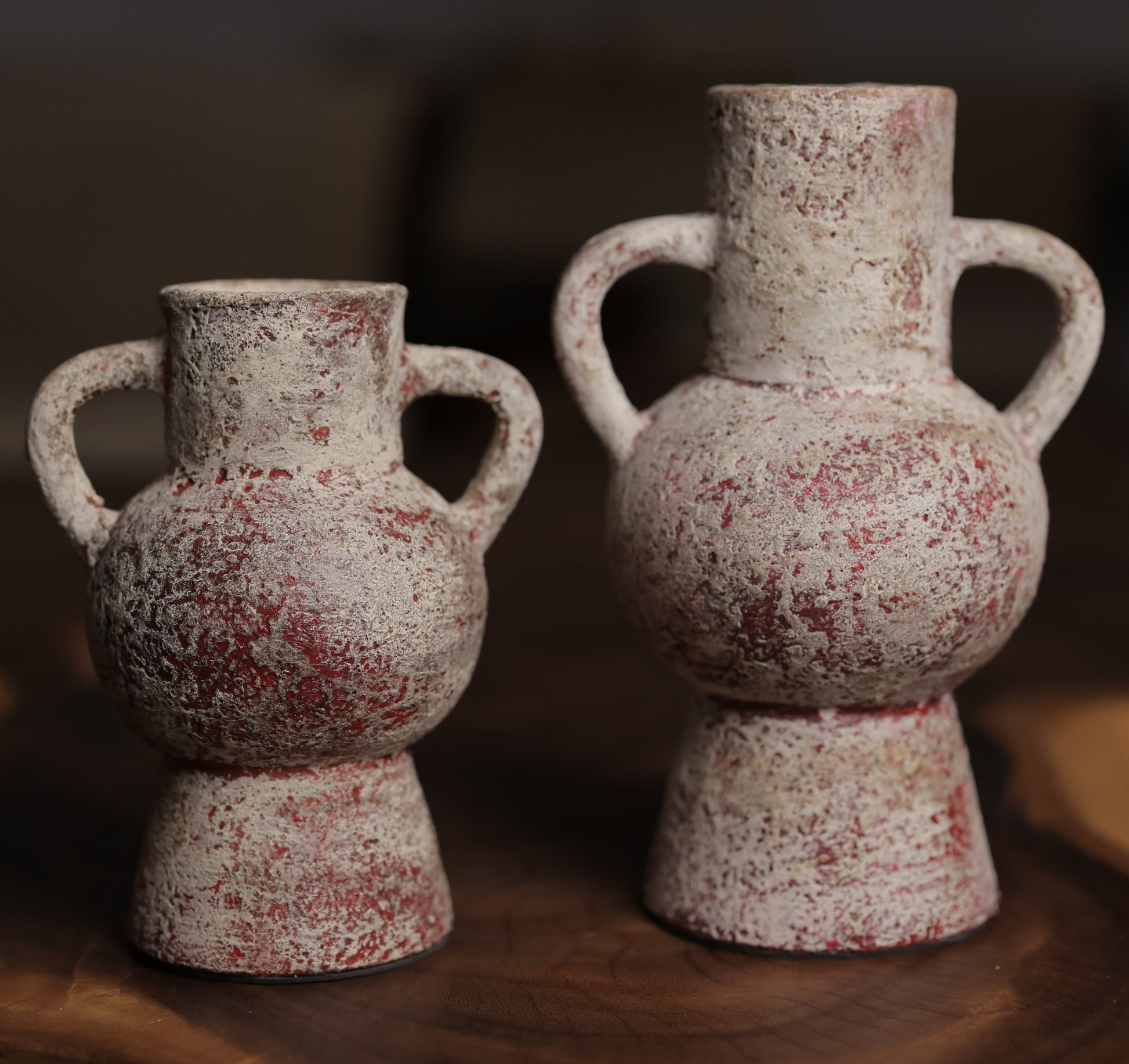 A vessel with an artifact's soul. This small amphora is hand-formed from terracotta, featuring classic twin handles and a robust silhouette. Its heavily distressed finish allows an earthy, rustic red to break through a chalky white top layer, creating a rich, weathered texture. Offered in two sizes, perfect for displaying together or as individual statement pieces
